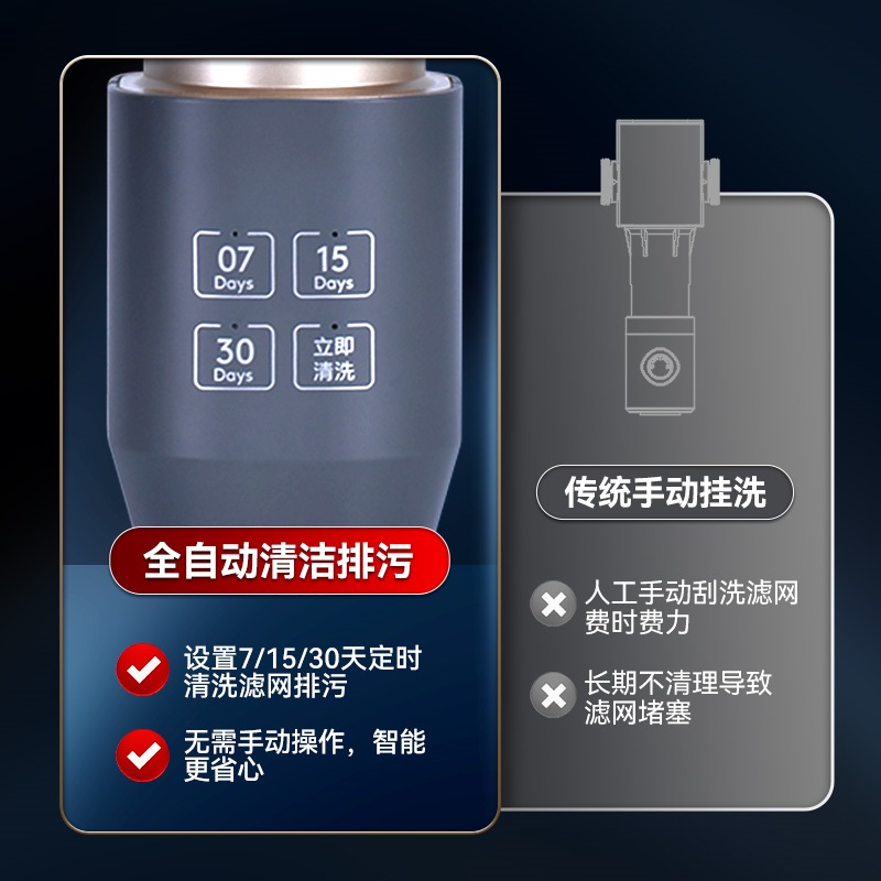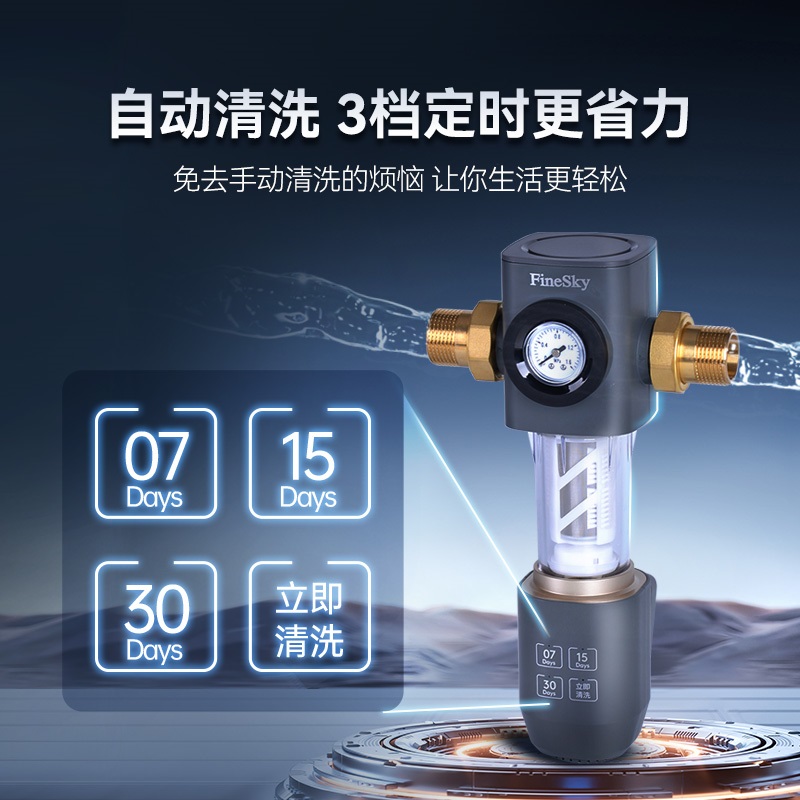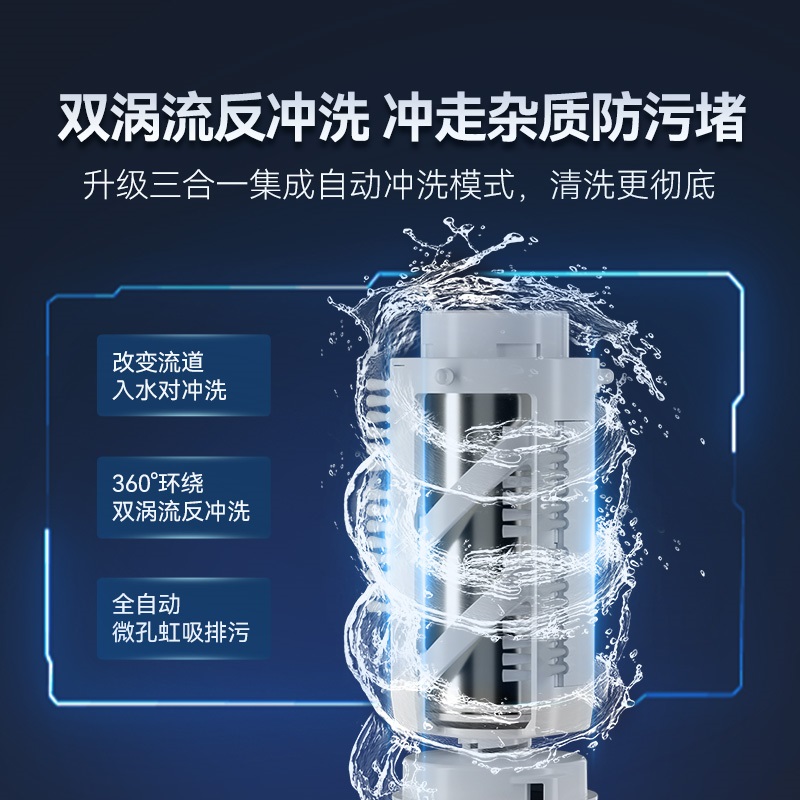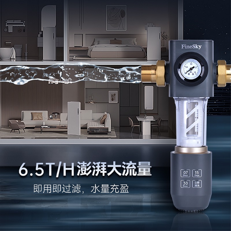 龍卷式深層清潔 反沖洗+雙面毛刷 40μm精密過濾 可視水壓表盤 316不銹鋼濾網終生免換,免拆洗 高分子航空級高韌性防爆濾瓶 6.5T/H澎湃大流量 H62+低鉛環(huán)保銅